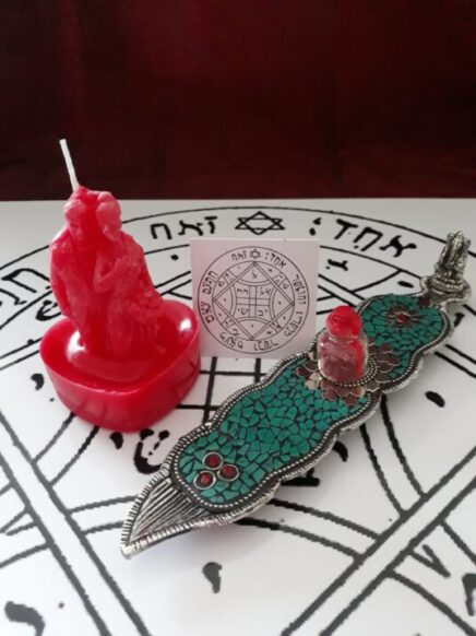 Il kit comprende: La procedura del rituale, tovaglietta pentagramma, candela rituale della coppia innamorata fatta a mano, incenso olibano, ampollina con polvere rituale dell’amore.